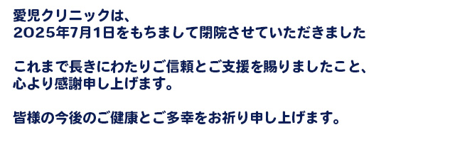 愛児クリニックは、2025年7月1日をもちまして閉院させていただきました